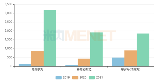 白云山陳李濟藥的胃瘍寧丸用于胃脘脹痛或刺痛、嘔吐泛酸,合肥華潤神鹿藥業(yè)的養(yǎng)胃舒顆粒具有抗炎鎮(zhèn)痛、改善胃泌酸增強消化機能、增強免疫功能作用,邯鄲制藥的摩羅丹(濃縮丸)則用于慢性萎縮性胃炎,三個獨家產(chǎn)品2021年在中國網(wǎng)上藥店終端的增速均超過100%。